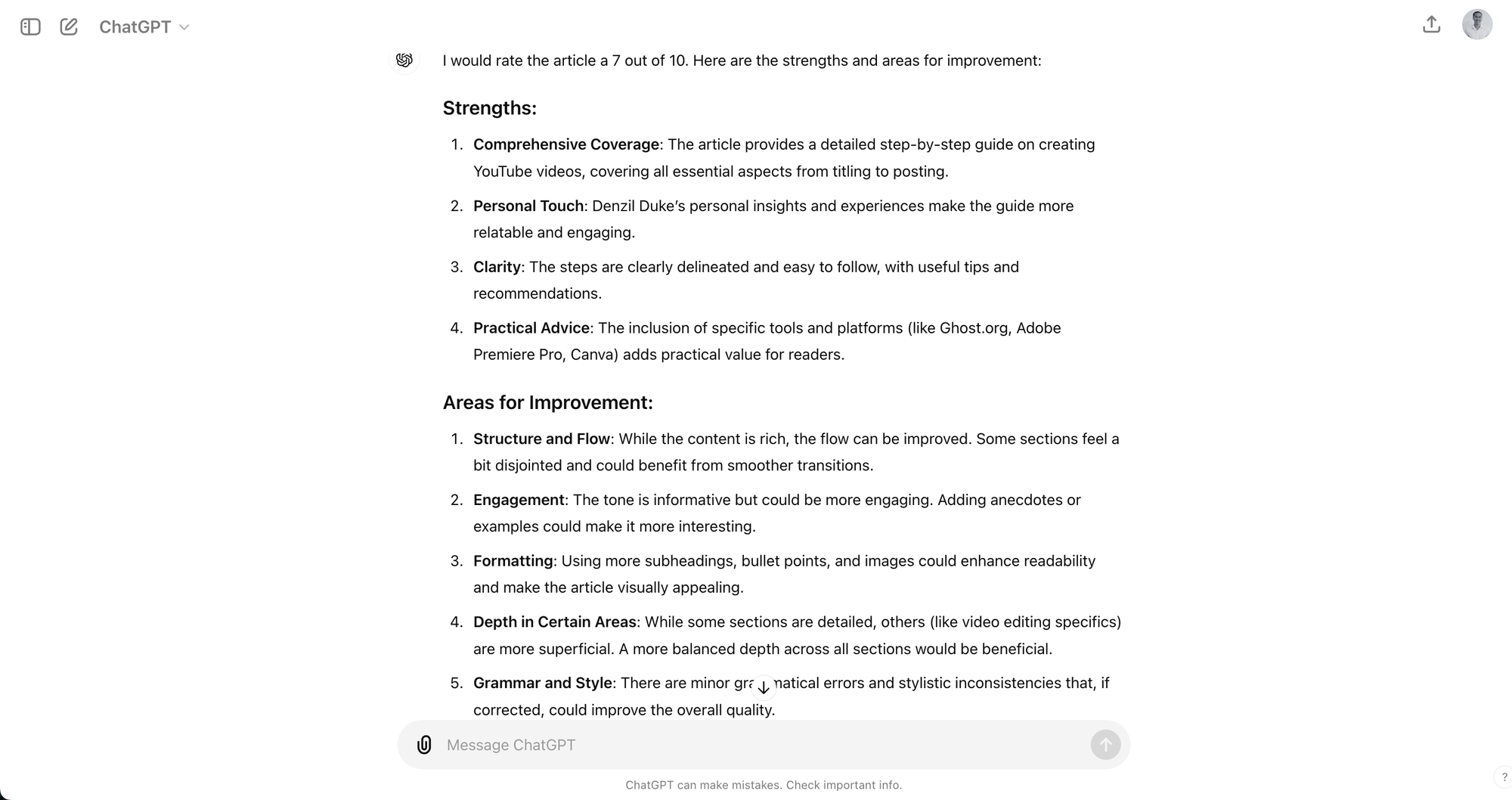 What pops up is a breakdown of how to improve the article. Then, I'll edit the script with the considerations from the AI.